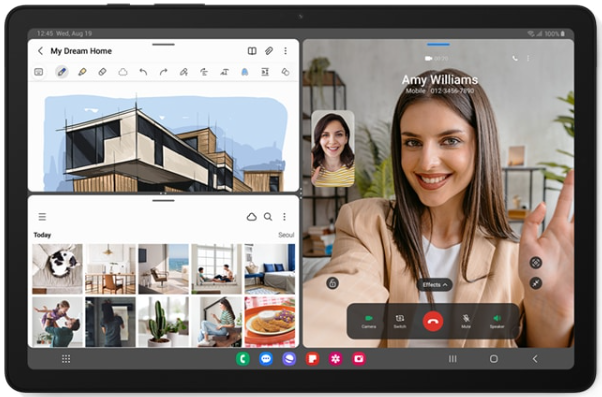- Divide la pantalla en 3, multiplica tu productividad: Galaxy Tab A9+ permite dividir la pantalla en tres para una eficiente acción multitarea, Esboza, visualiza y haz videollamadas con hasta 3 apps abiertas a la vez, sin tener que cerrar ninguna